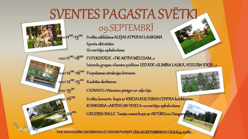 9. septembrī aicinām uz Sventes pagasta svētkiem Alejas atpūtas laukumā. No plkst. 11.00 līdz 13.00 - sporta aktivitātēs, radošās darbnīcas bērniem un piepūšamās atrakcijas. Svētku dalībniekiem būs iespēja apskatīt fotoizstādi, baudīt cienastu un noskatīties svētku koncertu. Vakarā - groziņu balle Sventes Tautas namā.