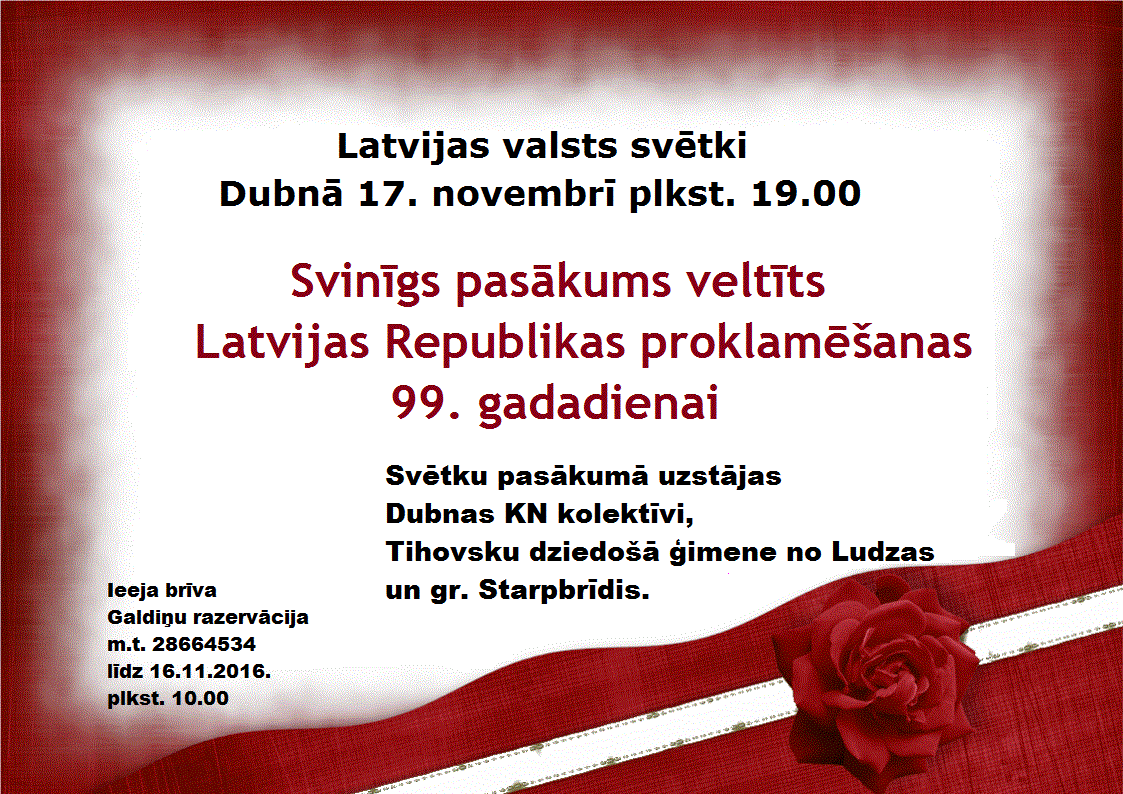 17.novembrī Dubnas kultūras nams aicina kopā sagaidīt Latvijas Republikas 99. dzimšanas dienu. Dzimšanas dienā pieņemts stāstīt par panākumiem, nopelniem, ieguvumiem, kā arī lietderīgi pavadīt svētku priekšvakaru kopā ar Dubnas kultūras nama pašdarbības kolektīviem un dziedošo Tihovsku ģimeni no Ludzas un izdejot svētku valsi ar grupu "Starpbrīdis". Esat mīļi gaidīti pasākumā!