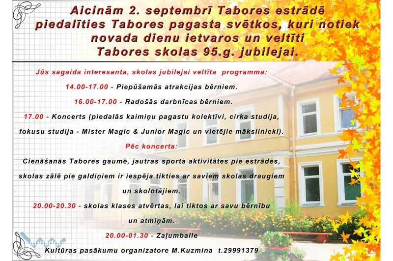 Tabores pagasta svētki22.08.2017AKTUĀLI Aicinām 2.septembrī Tabores estrādē piedalīties Tabores pagasta svētkos, kuri notiks Daugavpils novada dienu ietvaros un veltīti Tabores skolas 95.gadu jubilejai.