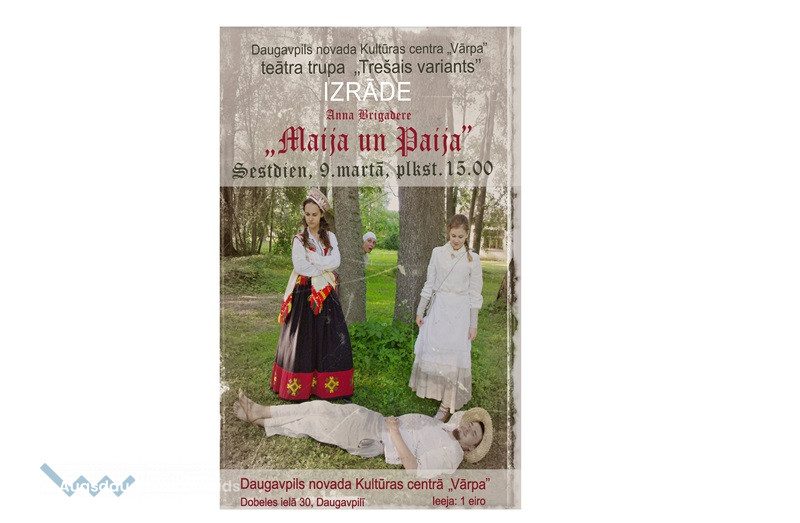 Daugavpils novada Kultūras centra Teātra trupa „Trešais variants” aicina uz izrādi „Maija un Paija” – Annas Brigaderes pasaku lugu divos cēlienos.