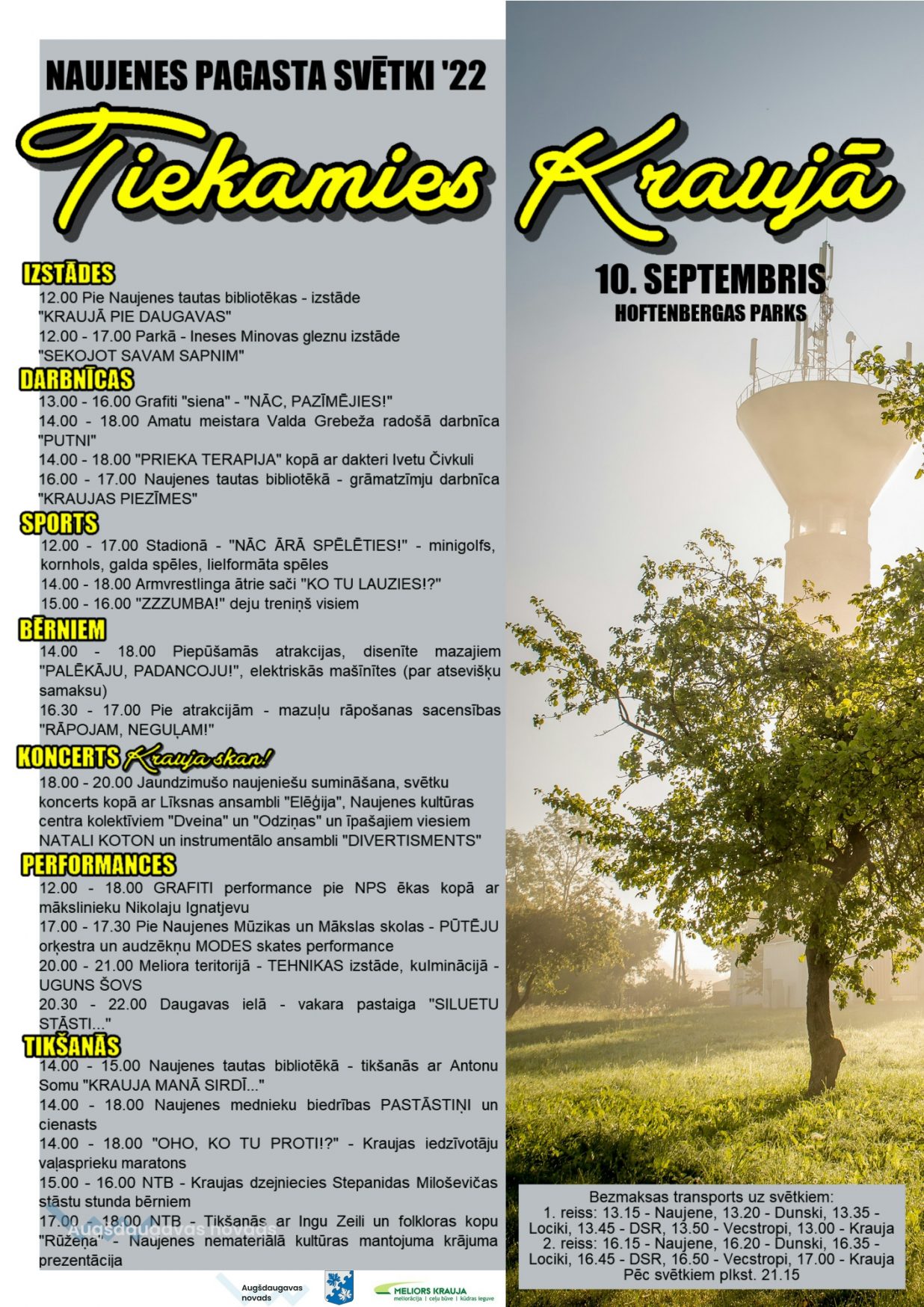 Naujenes pagasta svētki’22 ir klāt, šogad tos svinēsim 10. septembrī Kraujā, ābeļdārzu ieskautā ciemā, kas atrodas vienā no stāvākajiem Daugavas krastiem.