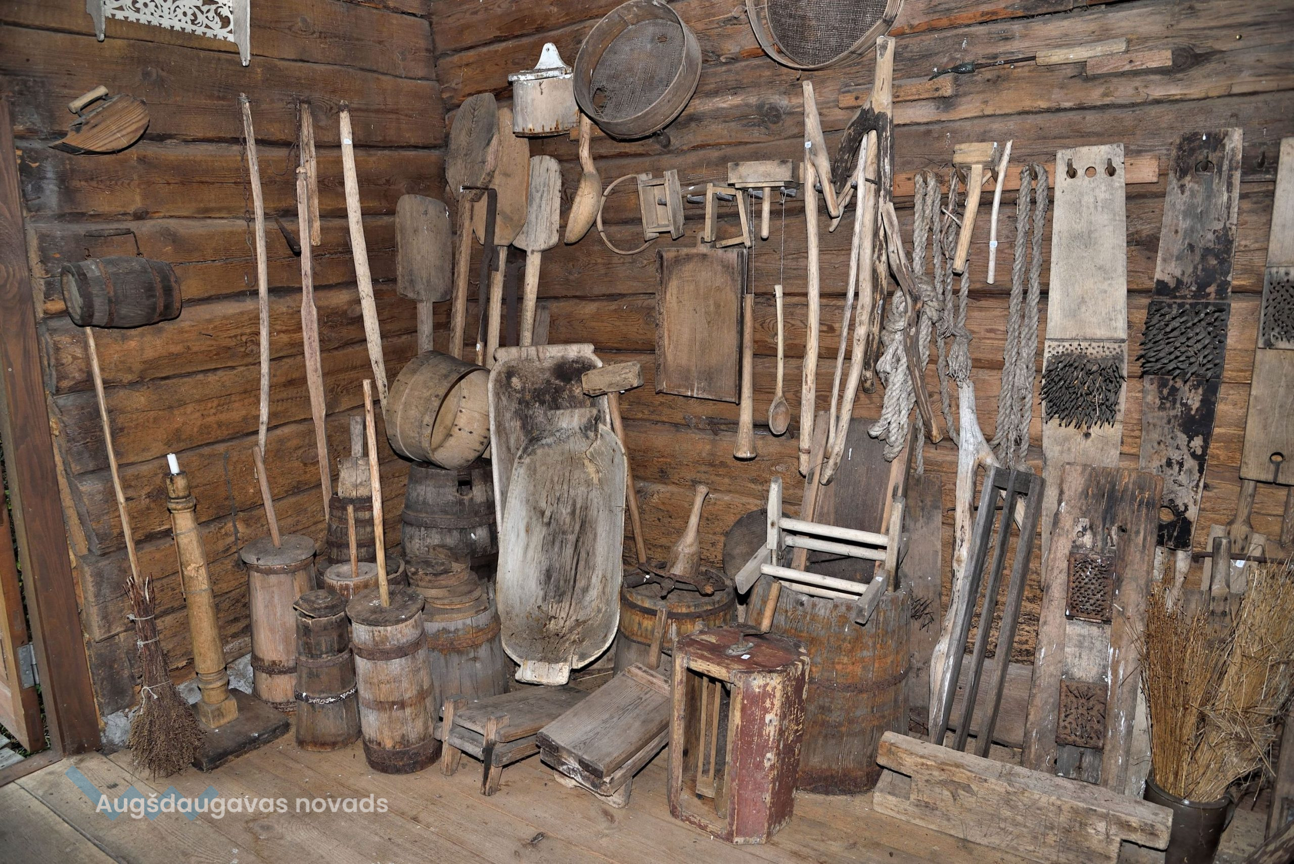 Blakus informācijas centram “Gulbji” ir izveidota ekspozīcija par koka priekšmetiem.