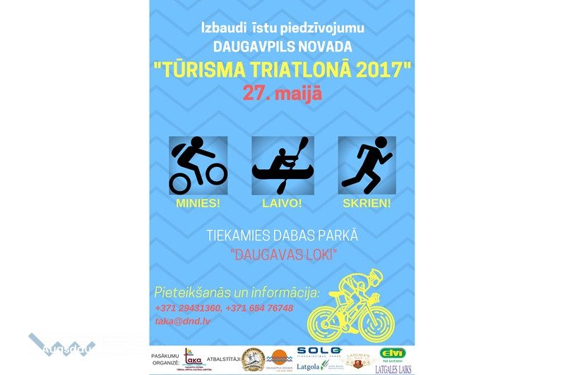 Tūrisma triatlons 201716.03.2017AKTUĀLI Izbaudi īstu piedzīvojumu Daugavpils novada "Tūrisma triatlonā 2017" 27. maijā! Minies, laivo un skrien gleznainajos Daugavas lokos - pieteikšanās un vairāk informācijas pa telefonu +371 654 76748; +371 29431360, e-pastu taka@dnd.lv. Tiekamies!"Tūrisma triatlona 2017" nolikums: NolikumsTT2017-DND