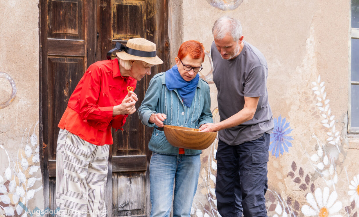 Plenērā piedalījās Rīgas Mākslas un Mediju tehnikuma pasniedzēji: Biruta Stafecka, Raita Rubļevska un Ģirts Semēvics. „Ošleju” mājas rotā auzas, rudzi, mieži un graudzāles, akcentam mākslinieki ir izmantojuši košas rudzupuķes, margrietiņas un nelielus klinģerus. Mākslinieks Ģirts Semēvics stāsta: „Kad mēs braucām uz šejieni, domājām un nevarējām saprast, kā te viss būs. Mājiņa bija redzēta mazā, melnbaltā bildītē gadu atpakaļ. Kaut kādas idejas pa galvu pinās, bet nekā konkrēta nebija. Prātā bija aizķēries, ka mājai ir četri stūri. Mums par laimi atradām četras labības - rudzi, auzas, kvieši un graudzāles, jo tās jebkurā labībā tomēr iezogas. Tāda bija sākotnējā ideja un tā šeit viss izveidojās. Protams, Dvietes dāmu vēlmes par kūlīšiem, pēc tam mēs radījām pļavu, kur aug rudzupuķes un margrietiņas, tā lēnām ideja apauga ar vērtīgiem ieteikumiem. Mums bija izcila sadarbība!” Mākslinieki ir saviļnoti par tik lielisku uzņemšanu Dvietē un par brīnišķīgo Sēlijas ainavu, ko redzējuši ceļā uz Dvieti: „Dabas reljefs šeit tiešām ir satriecošs! Mēs pa Latviju esam daudz braukājuši, daudz redzējuši, bet Sēlijas ainava ir tik episka un cēla! Tie nav Vecpiebalgas un Vidzemes kalniņi un arī Kurzeme tā nav. Ainava ir izcila, to tikai gleznot un gleznot!” stāsta B.Stafecka un Ģ.Semēvics. Plenērs „No grauda sākas dzīvība” notika, pateicoties Sēlijas kultūras programmas atbalstam.