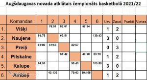 Decembra vidū startēja Augšdaugavas novada atklatais čempionāts basketbolā sadarbībā ar Latvijas basketbola savienību un biedrību “Ballborderbasket”. 24. decembrī aizvadīta kārtējā pirmā apļa spēle. Laukumā tikās Pilskalne un Ambeļi, rezultātā Pilskalne zaudēja Ambeļiem ar 63:70 pagarinājumā. Rezultatīvākie spēlētāji Pilskalnes komandā: A. Plinte 26 punkti un K. Briedis 15 p., Ambeļi: E. Repelis 40 p. un J. Umbraško 10 p. Nākamajā spēlē Naujene sacentās ar Preiļiem, un ar rezultātu 63:51 uzvaru izcīnīja Naujenes komanda. Rezultatīvākie spēlētāji Naujenes komandā: V. Gubanovs 18 p. un P. Dzalbe 12 p., bet Preiļou komandā K. Kurcenbaums 15 p. un A. Indrikovs 10 p. Savukārt Kalupes komanda tikās ar Višķu komandu, un ar rezultātu 94:57 uzvaru izcīnīja Kalupes komanda. Rezultatīvākie spēlētāji: Kalupe- Z.Saulītis 23 p. un J. Meškovskis 20 p., Višķi - G. Šidlovskis 19 p. un M. Umbraško 18 p. Nākamās pirmā apļa spēles notiks 2022. gada 22. janvārī. Kā redzam turnīra tabulā, pagaidām bez zaudējumiem cīnās divas komandas - Naujene un Kalupe.