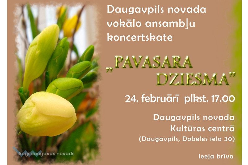 24.februārī plkst. 17.00 Daugavpils novada Kultūras centrā “Vārpa” (Dobeles ielā 30, Daugavpilī) notiks Daugavpils novada vokālo ansambļu koncertskate “Pavasara dziesma”.