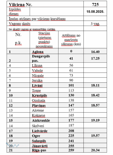 - 2025.gada 15.augustā norīkots vilciens Nr.725 plkst.16.40 no Aglonas uz Rīgu.