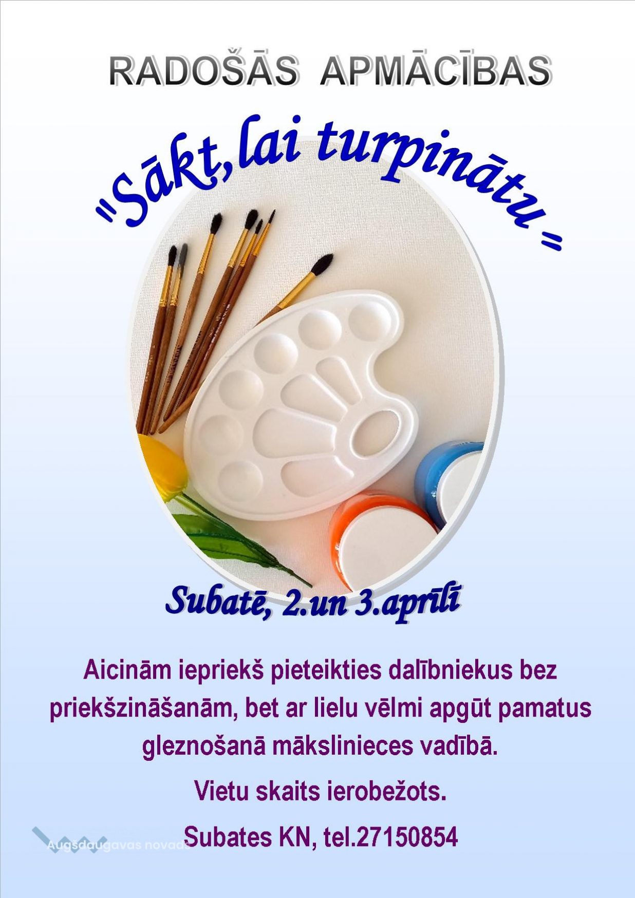 Tad lūk, šī ir tā iespēja izmēģināt, iepazīt, uzdrīkstēties. Piederumi darbam būs sarūpēti. Māksliniece Inta Paulsone no Jelgavas būs ar mums.
