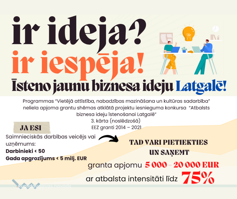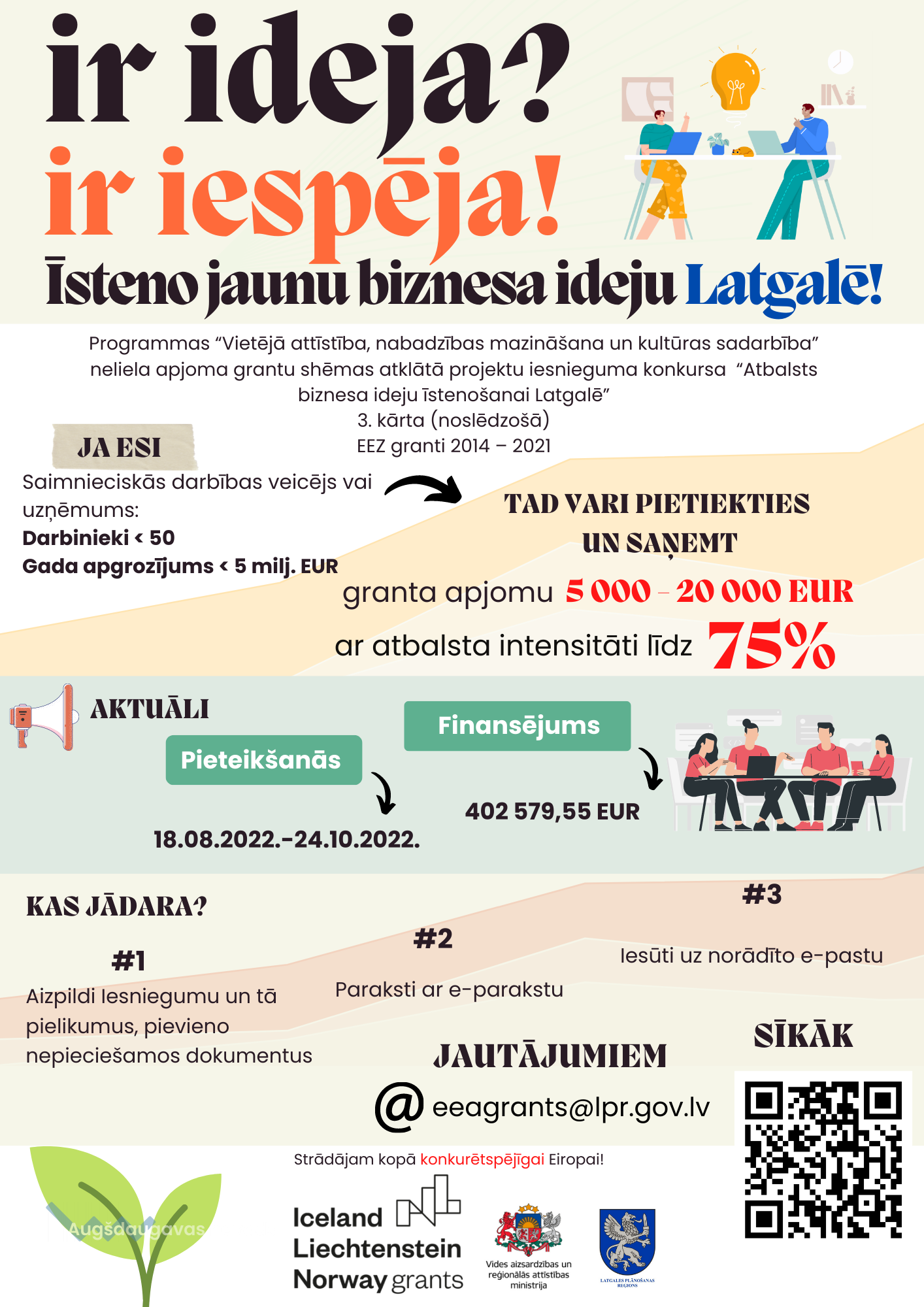 Latgales plānošanas reģions, sadarbībā ar Vides aizsardzības un reģionālas attīstības ministriju, ir aptaujājuši Latgales uzņēmējus un, ņemot vērā uzņēmēju sniegtās atbildes, veikuši grozījumus atklātā projektu konkursa “Atbalsts biznesa ideju īstenošanai Latgalē” EEZ grantu 2014.–2021. gada perioda programmas “Vietējā attīstība, nabadzības mazināšana un kultūras sadarbība” regulējošajos Ministru kabineta noteikumos un 18.08.2022. izsludina grantu konkursa trešo (noslēdzošo) kārtu ar labvēlīgākiem nosacījumiem.