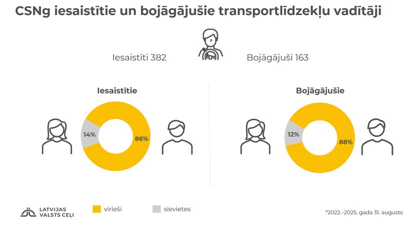 Ceļu satiksmes negadījumos ar bojāgājušajiem uz valsts autoceļiem laikā no 2022. līdz 2025. gada augusta beigām bija iesaistīti 378 transportlīdzekļu vadītāji, no tiem 163 gāja bojā. Starp iesaistītajiem transportlīdzekļu vadītājiem 86% bija vīrieši, 14% – sievietes. Starp bojāgājušajiem transportlīdzekļu vadītājiem 88% jeb 144 bojāgājušie bija vīrieši, bet 12% jeb 19 bojāgājušie bija sievietes.