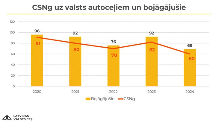 Pērn uz valsts autoceļiem Latvijā notika 60 ceļu satiksmes negadījumi ar bojāgājušajiem, kuros gāja bojā 69 cilvēki.