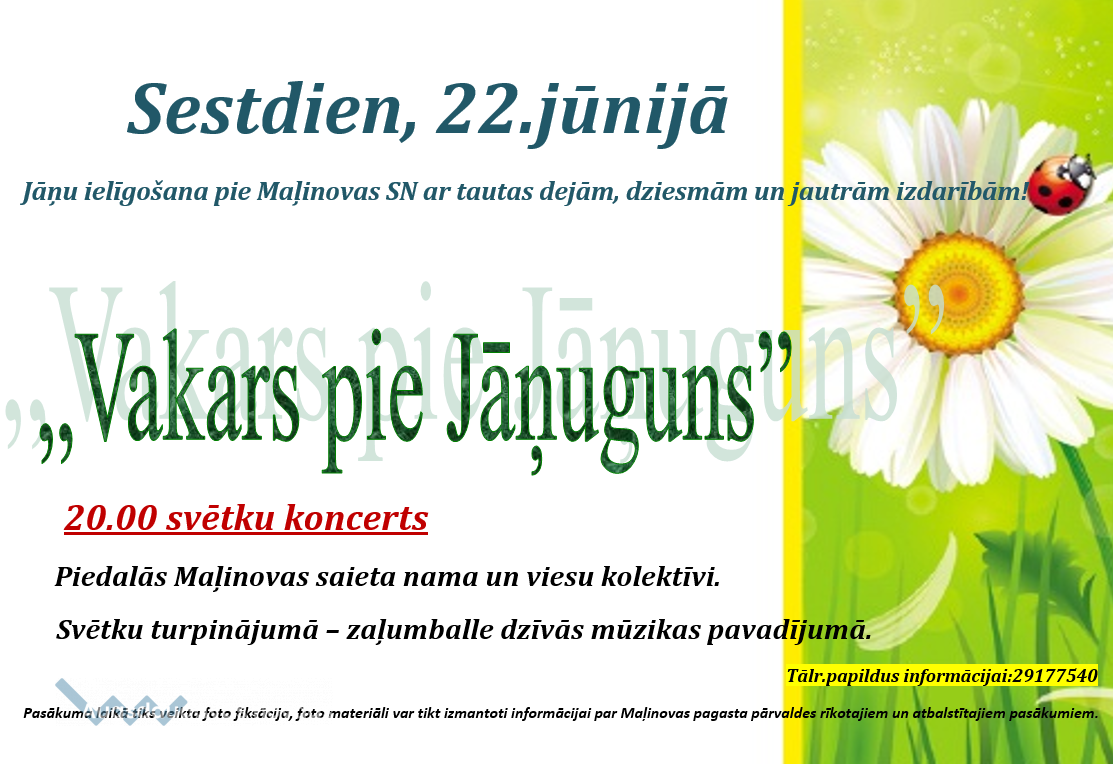 22. jūnijā nāciet un brauciet pie Maļinovas ugunskura, lai pavadītu vasaras saulgriežus! Sestdien, 22. jūnijā, Maļinovas saieta nams aicina uz ielīgošanas svētkiem "Vakars pie Jāņuguns"! Piedalās Maļinovas saieta nama un viesu kolektīvi. Svētku turpinājumā- zaļumballe dzīvās mūzikas pavadījumā.