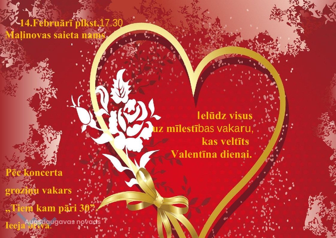 14. februārī pl. 17.30 Maļinovas saieta namā koncerts un groziņu vakars "Tiem, kam pāri 30". Ieeja brīva.