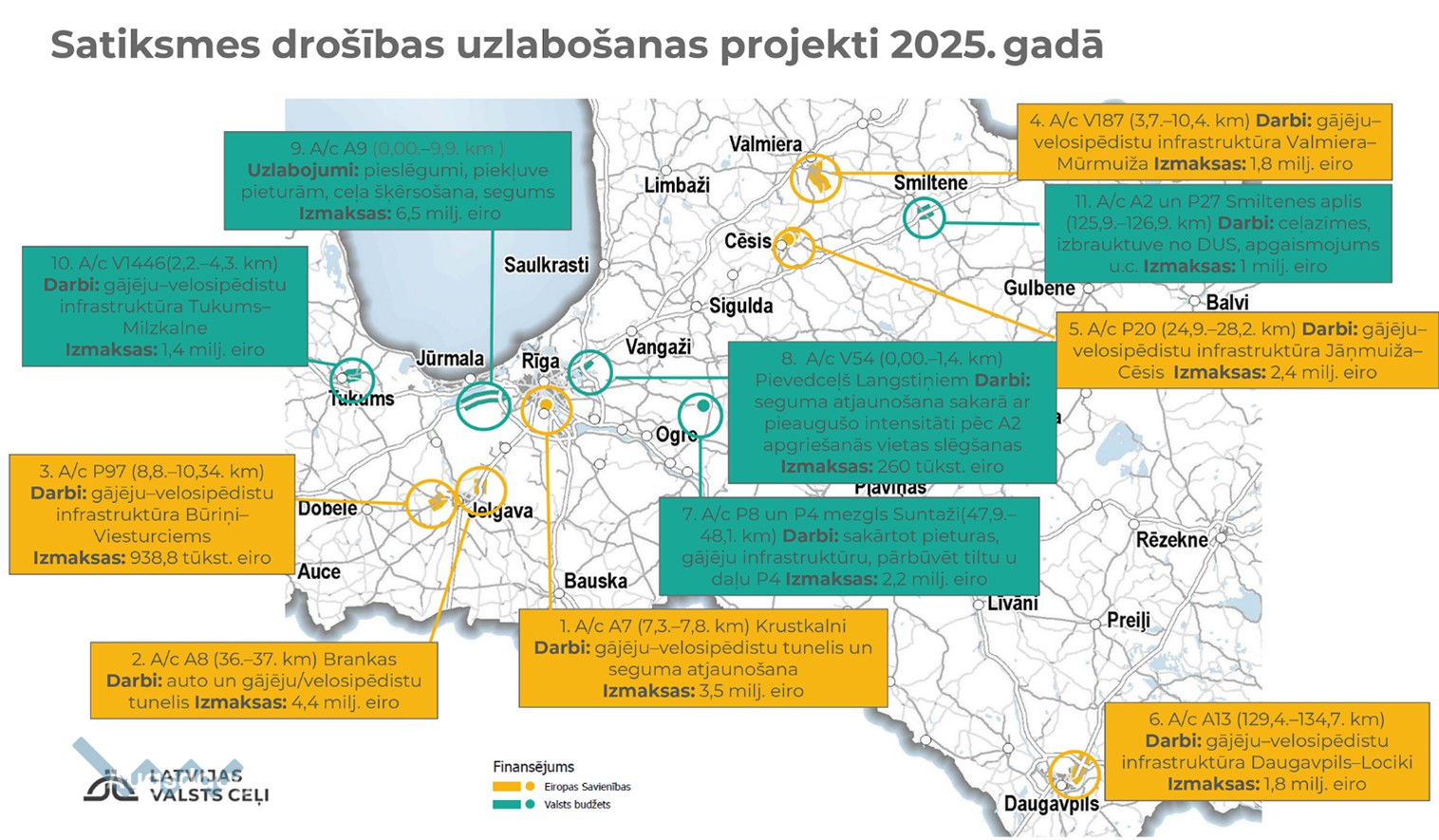 Satiksmes drošība valsts autoceļu tīklā katru gadu tiek uzlabota, realizējot autoceļu pārbūvi, kā arī atsevišķus satiksmes organizācijas uzlabošanas projektus. Šogad plānots pilnībā realizēt vai uzsākt 11 šādus projektus.