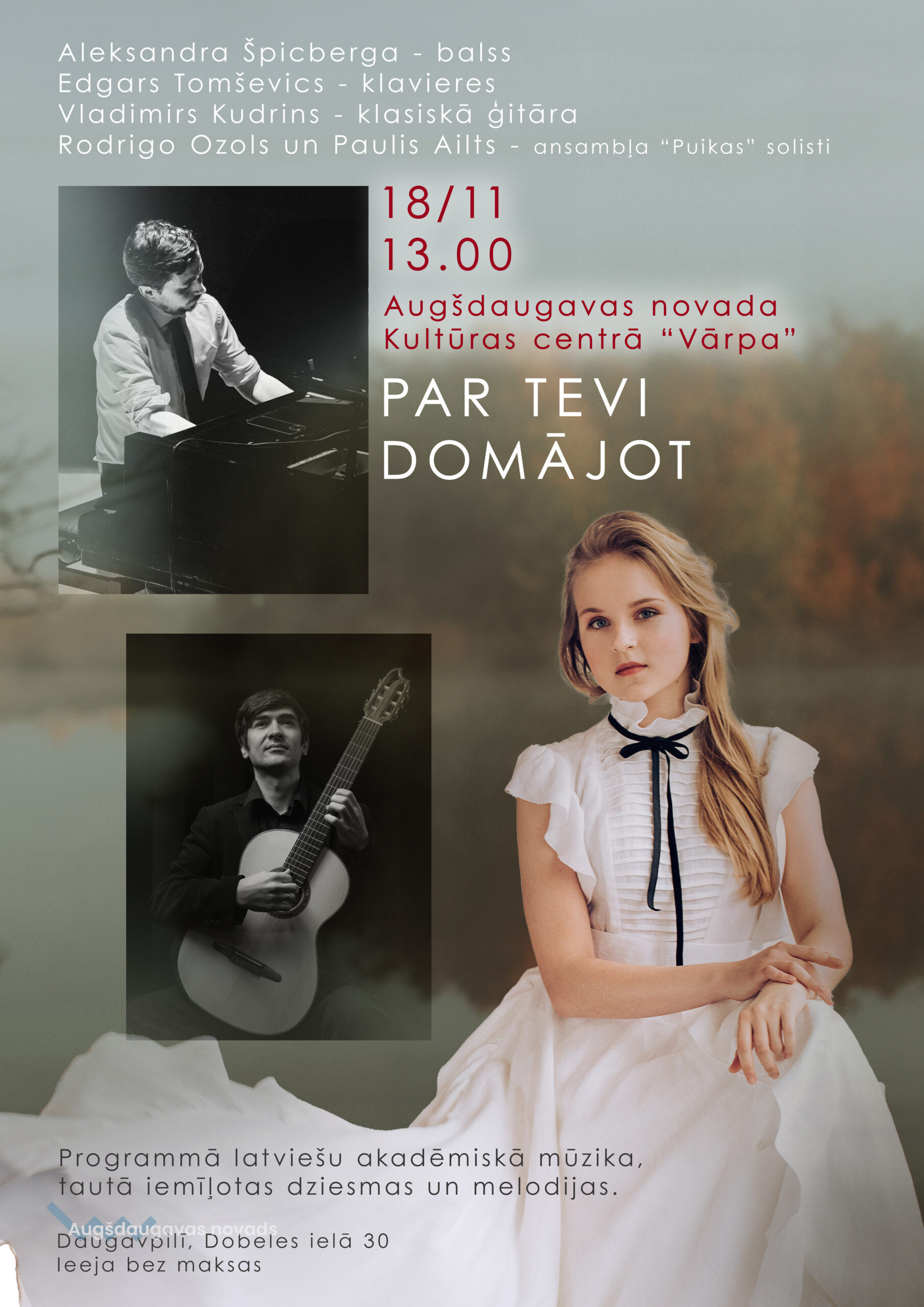 18. novembrī 13.00 svētku koncerts “Par tevi domājot” Programmā: Aleksandra Špicberga – balss, Edgars Tomševics – klavieres, Vladimirs Kudrins - klasiskā ģitāra, Rodrigo Ozols un Pauls Ailte, vokālās grupas "Puika" solisti. Ieeja bez maksas.