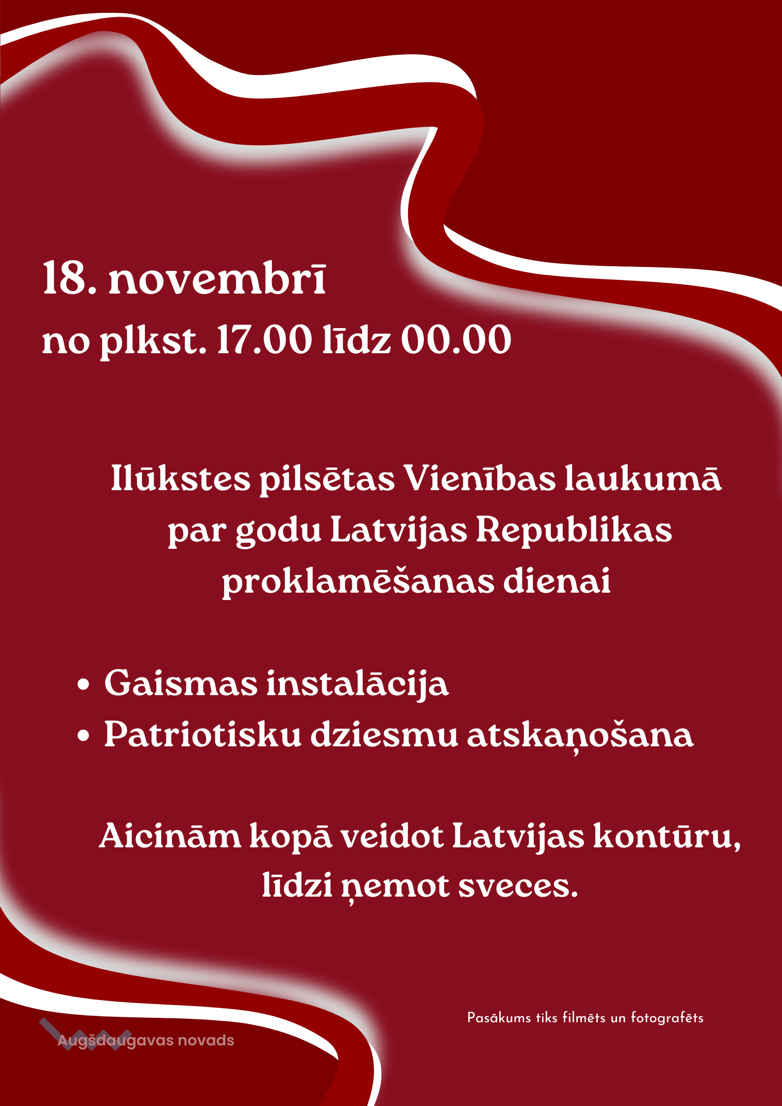 18. novembrī no 17.00 līdz 22.00 Ilūkstes Vienības laukumā gaismas instalācijas un patriotisko dziesmu atskaņošana