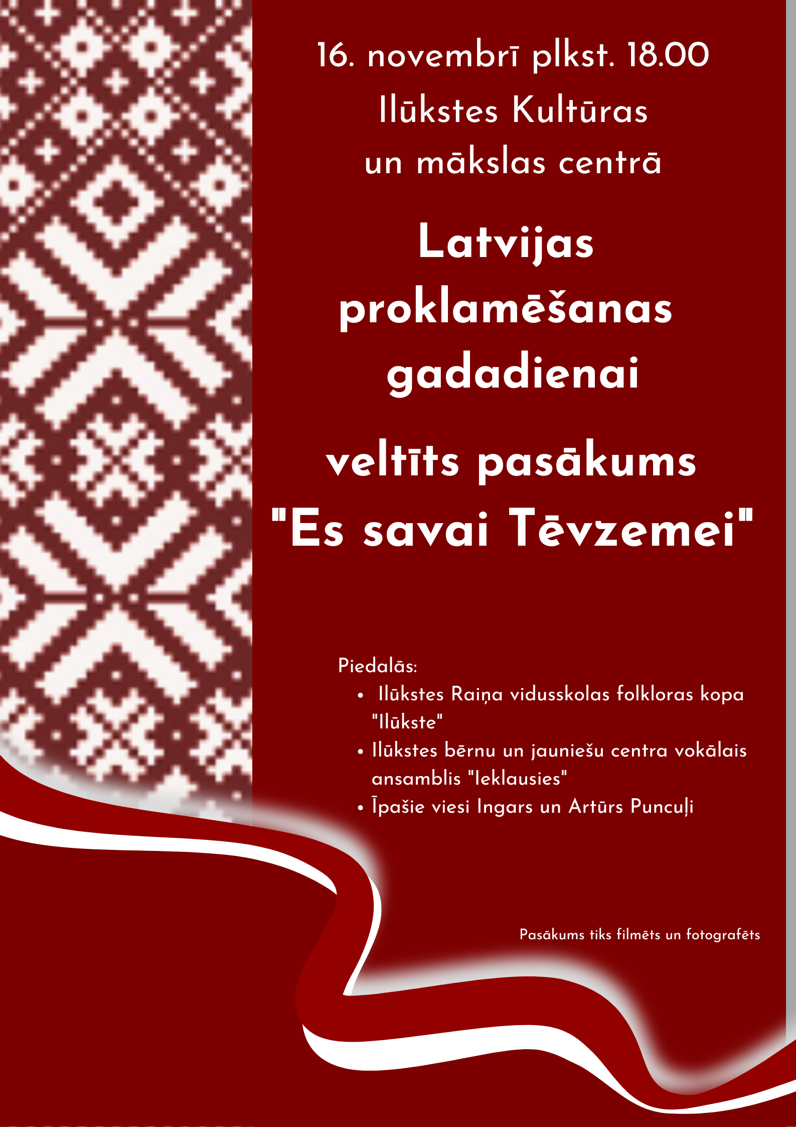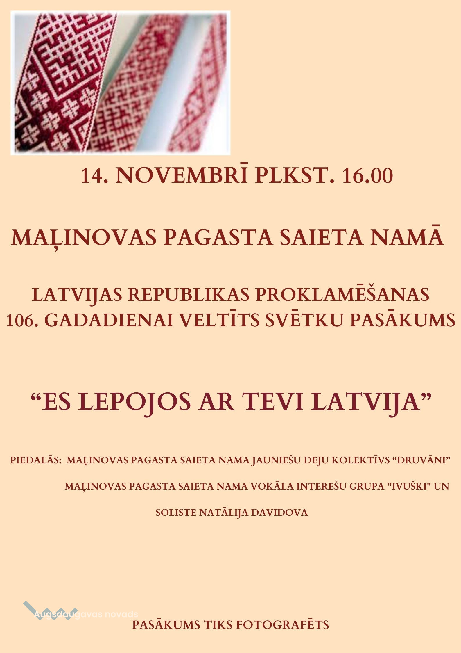 14. novembrī 16.00 Maļinovas pagasta saieta namā Latvijas Republikas proklamēšanas 106. gadadienai veltīts svētku pasākums "Es lepojos ar Tevi, Latvija!"