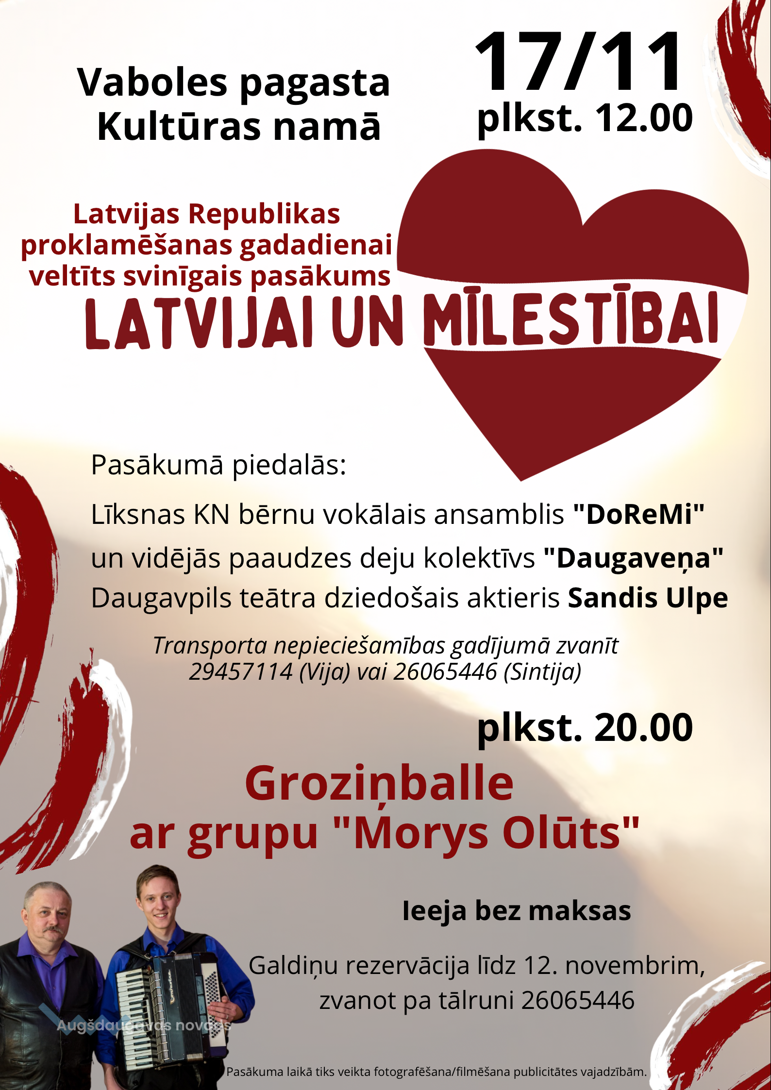 17. novembrī 12.00 Vaboles pagasta Kultūras namā Latvijas Republikas proklamēšanas gadadienai veltīts svinīgais pasākums "Latvijai un mīlestībai". 20.00 groziņballe ar Daini un Jāni Somiem. Galdiņu rezervācija līdz 12. novembrim pa tālr. 26065446 (Sintija)