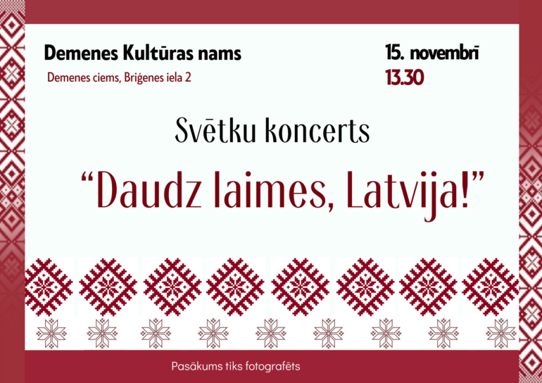 15. novembrī plkst. 13.30 Demenes pagasta Kultūras namā Latvijas Republikas proklamēšanas 106. gadadienai veltīts koncerts.