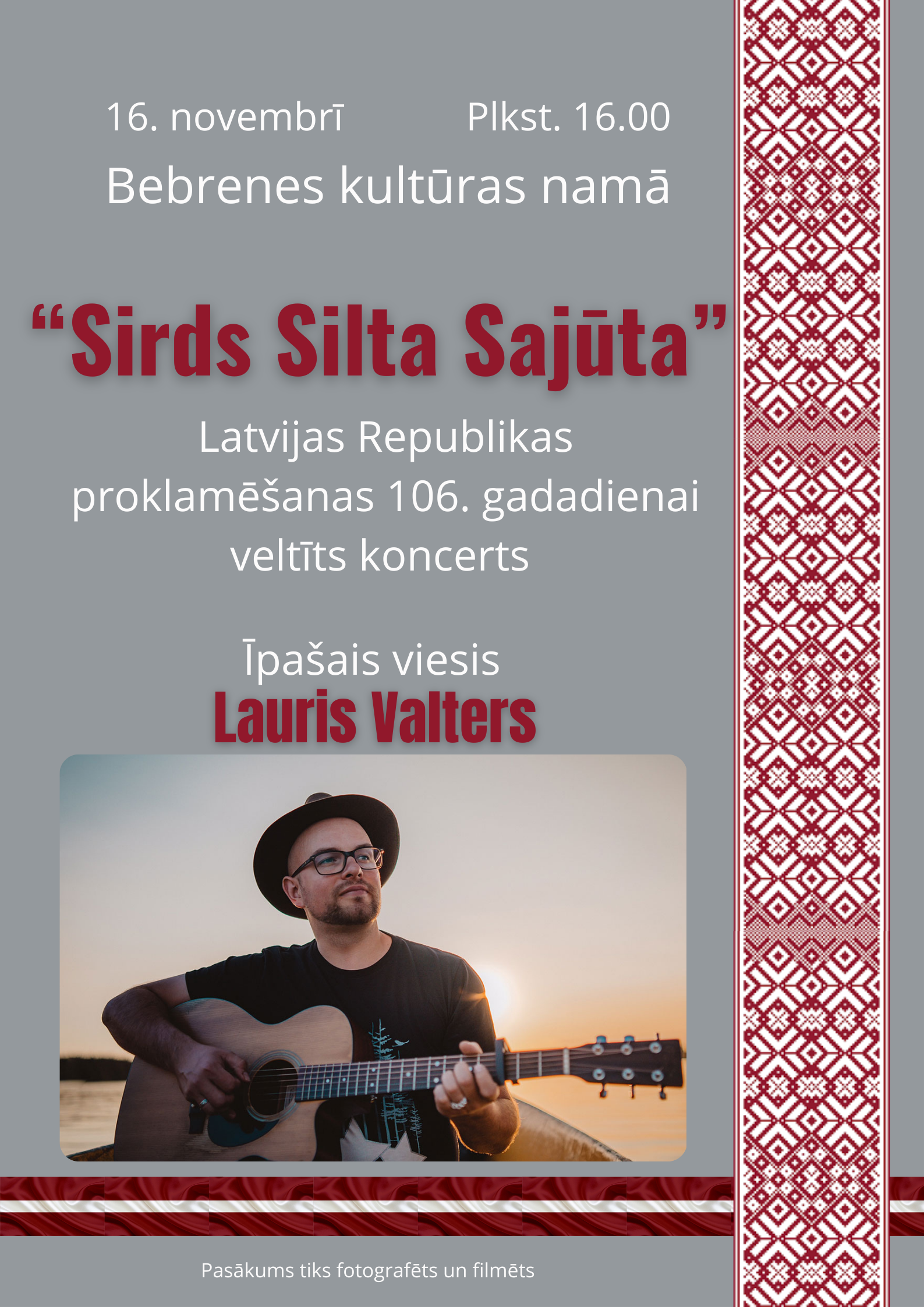 16. novembrī, 16.00, Bebrenes Kultūras namā, Laura Valtera koncerts “Sirds Silta Sajūta”, veltīts Latvijas Republikas proklamēšanas 106.gadadienai.