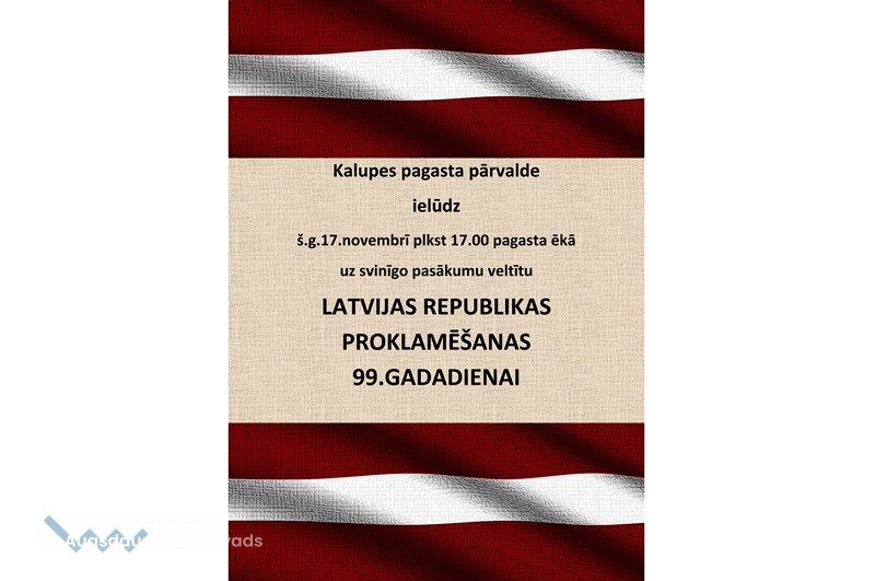 17. novembrī plkst. 17.00 Kalupes pagasta pārvaldes ēkā ieskandināsim Latvijas Republikas proklamēšanas 99. gadadienu kopā ar folkloras kopu "Kolupkas” , vīru vokālo ansambli "Čvartaks”, Eiropas deju kopu "Balance”, Špoģu Mūzikas un mākslas skolas akordeonistu ansambli (Kalupes pamatskolas skolēni). Svinīgā pasākuma gaitā sumināsim kalupiešus un Henriha Kivlinieka atkārtoti izdotās grāmatas "Kalupe un kalupieši” prezentāciju.