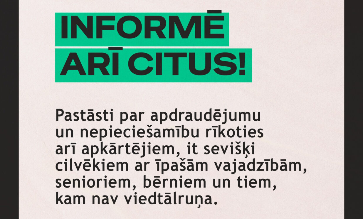 informē arī citus! Pastāsti par apdraudējumu un nepieciešamību rīkoties arī apkārtējiem, it sevišķi cilvēkiem ar īpašām vajadzībām, senioriem, bērniem un tiem, kam nav viedtālruņa;