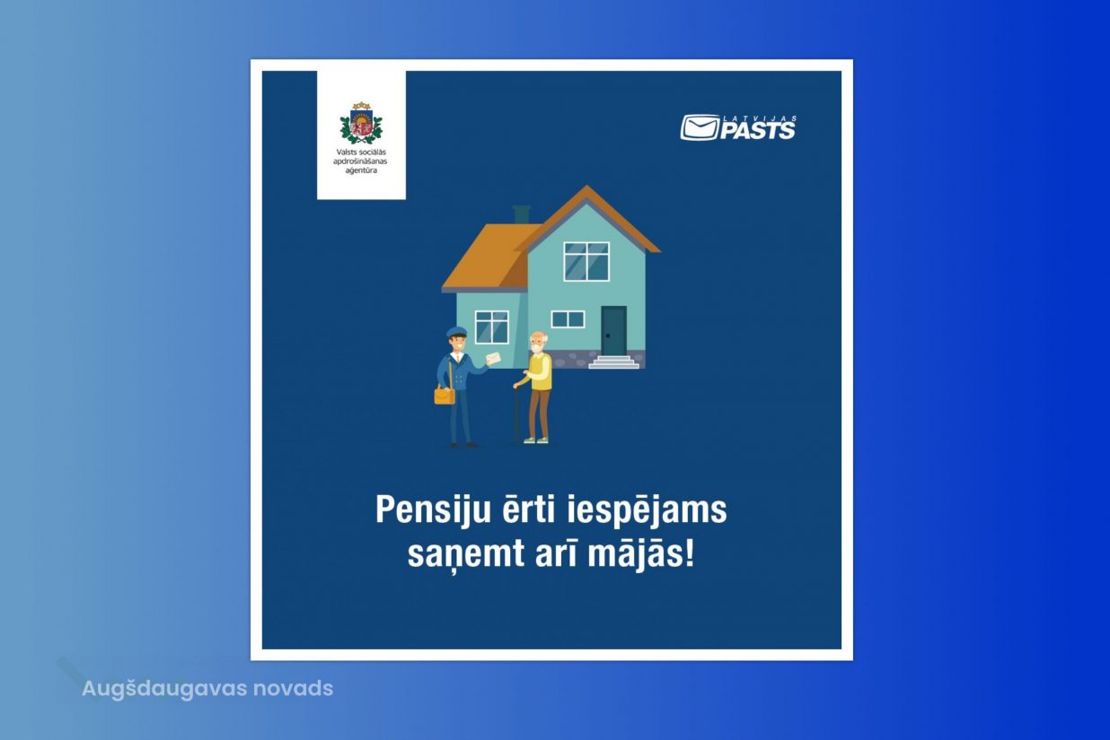 Ņemot vērā prasības Covid-19 izplatības ierobežošanai, kas samazina apkalpošanas iespējas pasta nodaļās vienam klientam noteiktās platības dēļ un paredz ilgāku pakalpojuma gaidīšanas laiku, kā arī veselības riskus, ko var radīt klātienes apmeklējums, Latvijas Pasts un Valsts sociālās apdrošināšanas aģentūra (VSAA) atgādina, ka pensiju iespējams saņemt savā dzīvesvietā, piesakot šo pakalpojumu VSAA.