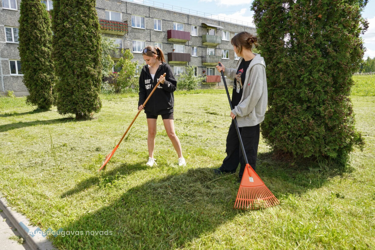 Naujenes ciematā teritorijas uzkopšanā darbojas divas meitenes – Eva un Viktorija, kuras grābj svaigi nopļauto zāli. Abas jaunietes jau pērn guvušas pieredzi vasaras darbos, uzkopjot pagasta teritoriju un brāļu kapus. Meitenes atzīst, ka iesaistījušās darbos, lai nopelnītu sev naudu un arī mazāk laika pavadītu mobilajos tālruņos.