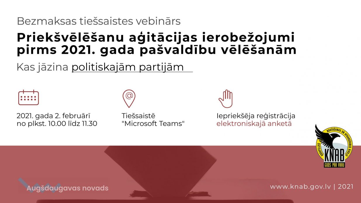 2021. gada 6. februārī sākas 120 dienu garais priekšvēlēšanu aģitācijas periods pirms 5. jūnijā gaidāmajām pašvaldību vēlēšanām. Korupcijas novēršanas un apkarošanas birojs (KNAB) kā viena no priekšvēlēšanu aģitācijas uzraugošajām iestādēm aicina politiskās partijas, kas plāno startēt pašvaldību vēlēšanās, 2. februārī no plkst. 10.00 līdz 11.30 piedalīties bezmaksas tiešsaistes vebinārā par priekšvēlēšanu aģitācijas perioda ierobežojumiem.