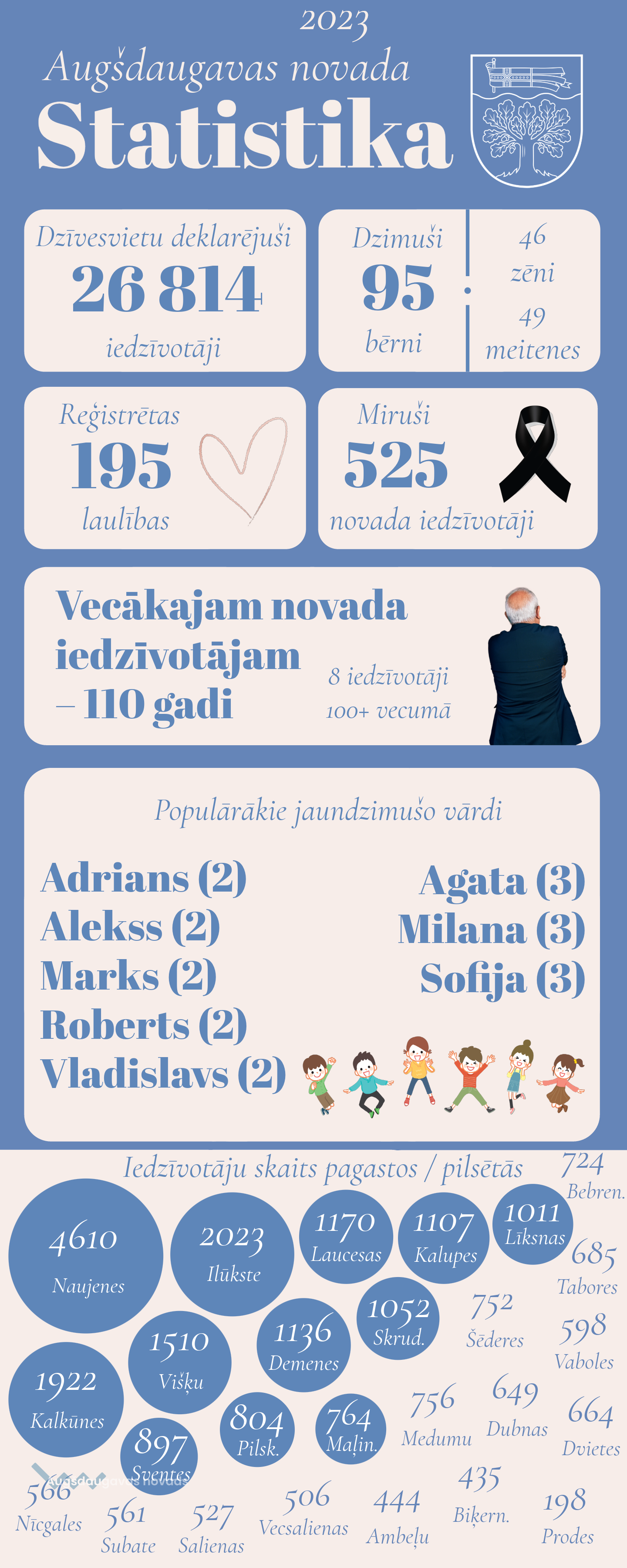 2023. gadā Augšdaugavas novada Dzimtsarakstu nodaļā reģistrēti 95 bērniņi – 46 zēni un 49 meitenes. Novada ģimenēs dzimis 1 dvīņu pāris - dēliņi Marks un Vladislavs.