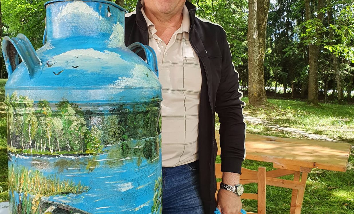 Skaistu gleznojumu uz piena kannas radīja pensionāre Janina Zajceva, kura īsi pirms pandēmijas sāka apgūt akvareļu tehniku un uzgleznojusi jau vairāk nekā 150 darbus.