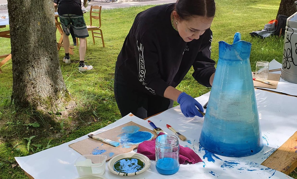 Gleznošana kā vaļasprieks ir radošās darbnīcas dalībniecēm Jeļenai Požarskai un Inesei Minovai, kuras šo jomu apgūst soli pa solim pašmācības ceļā. Jeļenas izpildījumā piena kanna izplauka krāšņos ziedos, savukārt Inese uzgleznoja Medumu ezeru vakara noskaņā.