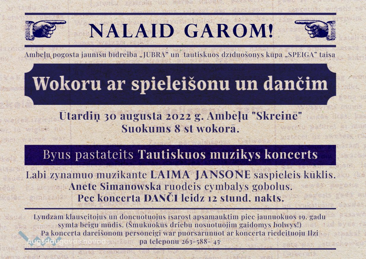 Gaidīsim visus uz dančiem un Laimas Jansones koncertu 30.08.2022. plkst:20:00 Ambeļu estrādē (vai Mednieku namiņā, ja laikapstākļi nelutinās). Dancotājiem un klausītājiem 19. gs. tērpos balvas par smukākajiem tērpiem!