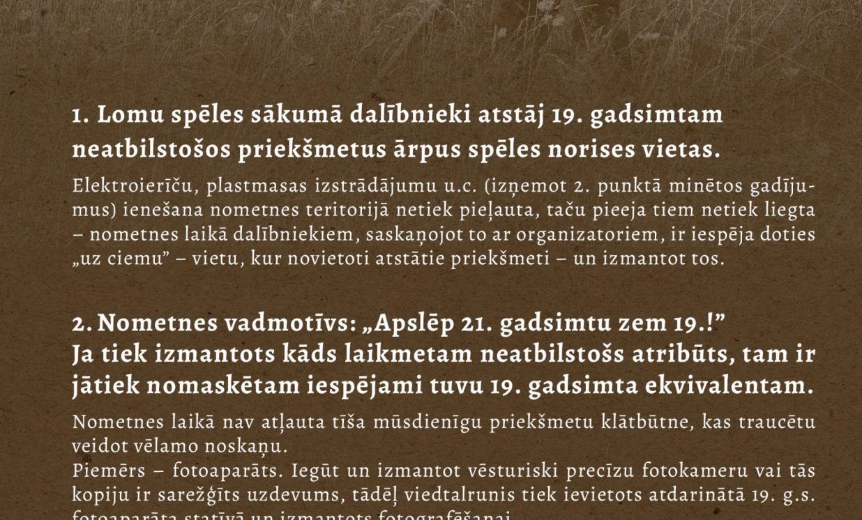 "Nometnē jeb "amatnieka sētā" "Saimniece" ar palīdzi uztrauksies par piedegušo putru, bet "Saimnieces meita" un viņas "Draudzenes ar "Mājskolotājas" palīdzību gatavosies "mācībām Krāslavas meiteņu ģimnāzijā". "Dēls", kurš "nepabeidzis studijas Tērbatā" palīdzēs saimiekot mājā un skaldīs malku tās pašas putras vārīšanai, sarunās ar draugiem "Studentiem", kas atbraukuši talkā iekārtot "nesen iepirkto māju", diskutēs par nacionālisma un citām modīgām idejām, kamēr "Fotogrāfa māceklis" svaidīsies ar sarkastiskiem komentāriem un uzņems "gaismas bildes". "Vaļiniece", kas "palīdz kārtot jauno studenšu pūru", piepalīdzēs ar jostu un dažādu noderīgu rīku gatavošanu, bet naktis tiks pavadītas pie ugunskura pieguļā," stāsta nometnes organizatore Ilze Mežniece par plānoto. "Mēs aicināsim dalībniekus abas dienas pieturēties pie sevis izvēlētās lomas un darboties, runāt un pat domāt tā, it kā loma būtu viņa "otrā āda", lai kopā radītu īstuma šķitumu. Centīsimies kopā saprast, ar ko sākas katra sadzīvē vajadzīgā lieta, cik tulznu ir vajadzīgs tās izgatavošanai un cik soļu pa dienu jānoiet, lai pēc vakara mielasta varētu labpatikā ielēkt dancī."