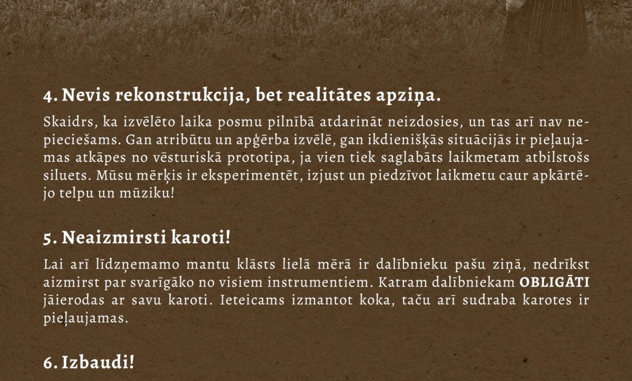 Pat ja laikmets līdz sīkākajai detaļai neatbildīs, organizatori cer kopā ar nometnes dalībniekiem radīt izpratni par ikdienu, kurā varēja "dziedot mūžu nodzīvot" ne reizi pāri nenodarot pat "ne guntiņas pagalei" un kurā Dievs saņēma ciešāk savu mēteli, lai pa ļaužu "šaurajām duravām" nāktu ar ļaudīm kopā svētkus svētīt.
