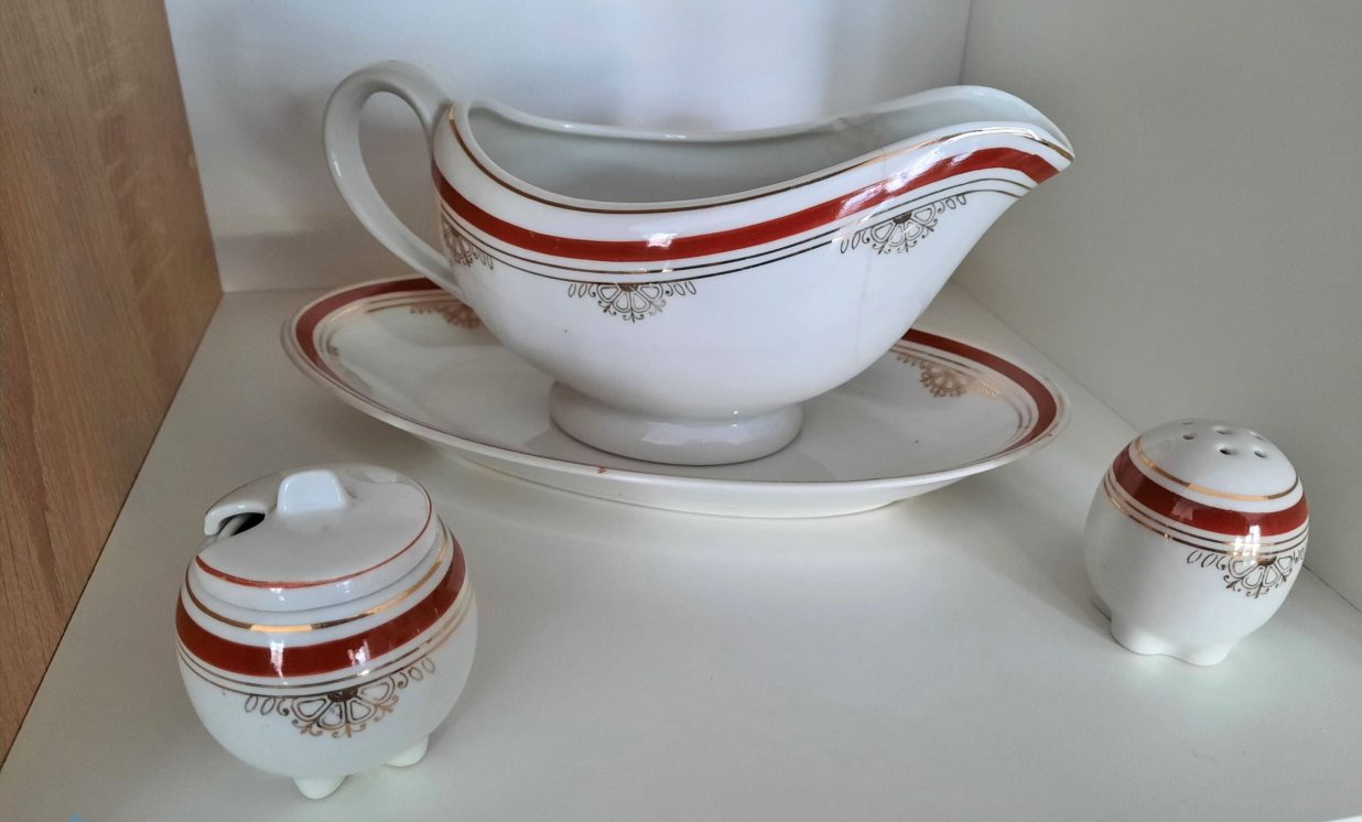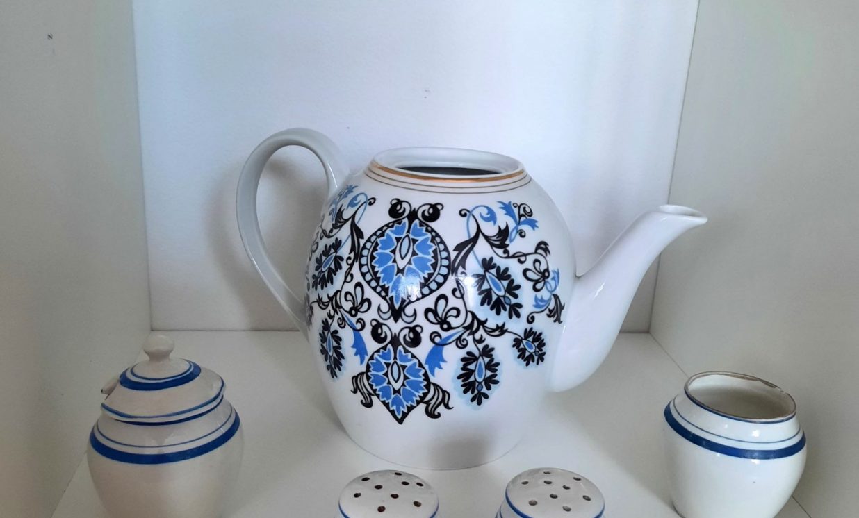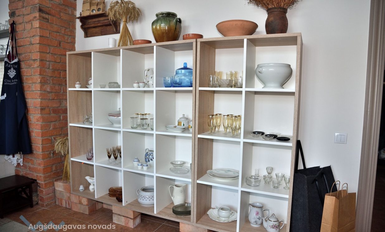 Izstādē ir aplūkojami dažādi trauki – zupas terīnes, šķīvji, tējas servīzes, glāzes, galda piederumi, arī lielās krūkas, sauktas Latgalē par išbuoniem.