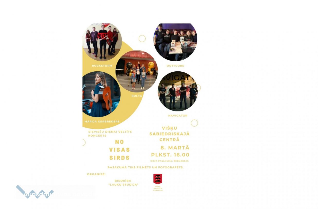 8. martā plkst. 16.00 Višķu pagasta Sabiedriskā centra zālē notiks Sieviešu dienai veltīts koncerts “No visas sirds”. Koncertā piedalīsies Višķu pagasta biedrības “Lauku studija” vokāli instrumentālie ansambļi “BULTA”, “ROCKSTORM”, “OUTTCORE”, vokāli instrumentālais ansamblis “NAVIGATOR” un soliste – ģitāriste Marija Gerbredere no Daugavpils. Ieeja bezmaksas. Pasākumā tiks filmēts un fotografēts.