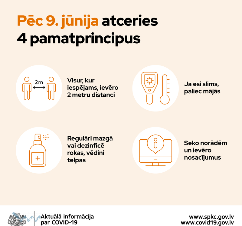 Pamatprincipi ir nemainīgi – visur, kur ir iespējams, ievēro 2 metru distanci, mazgā rokas, paliec mājās, ja esi saslimis un seko līdzi informatīvajām norādēm, piemēram, sabiedriskās vietās, kā arī izpildi konkrētā pakalpojuma sniedzēja vai pasākuma organizētāja norādījumus.