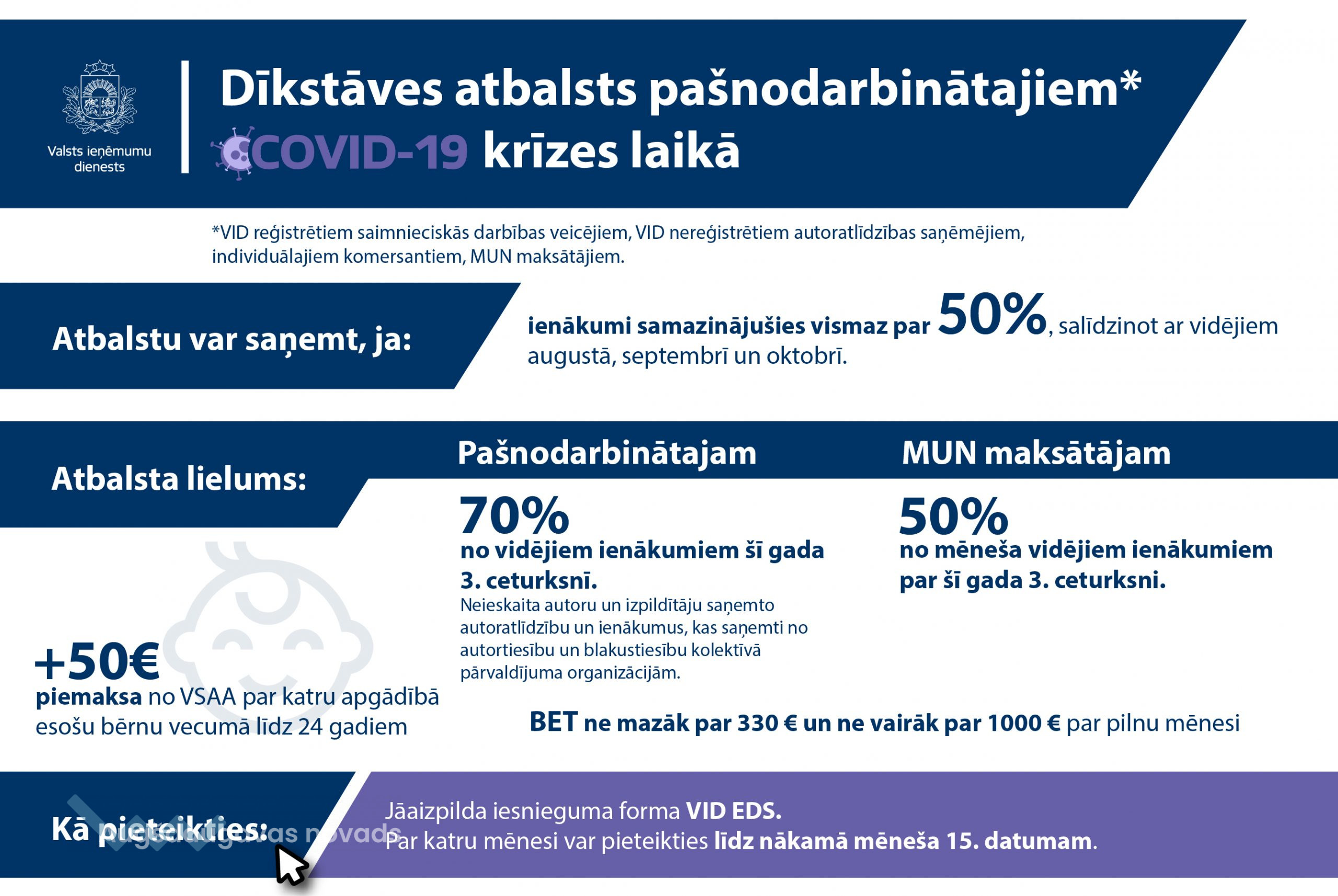 Lai palīdzētu tautsaimniecībā aktīvajiem iedzīvotājiem Covid-19 dēļ noteikto ierobežojumu laikā, Ministru kabinets ir pieņēmis noteikumus[1], paredzot atbalsta pasākumus darbinieku atlīdzību, kā arī pašnodarbināto un patentmaksātāju ienākumu kompensēšanai. Atbalsta izmaksu nodrošinās Valsts ieņēmumu dienests (VID) un pieteikumus Elektroniskās deklarēšanas sistēmā (EDS) varēs iesniegt, sākot no 1. decembra.