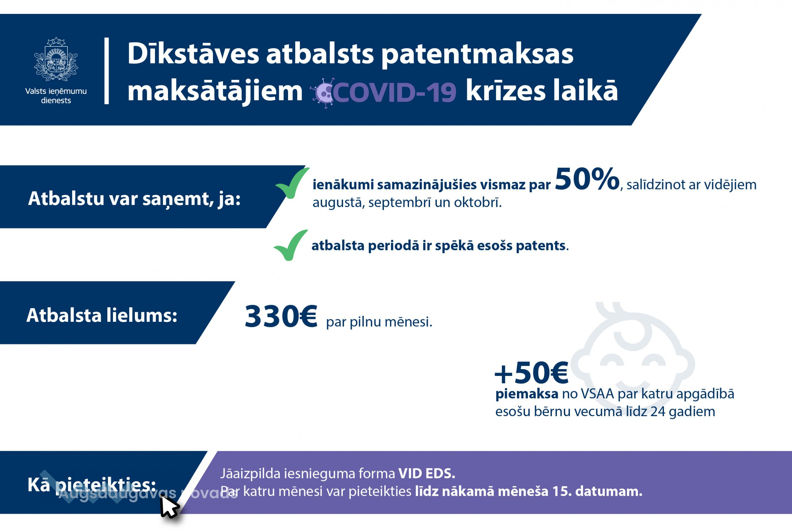 Savukārt patentmaksas maksātājam pieejams fiksēts atbalsts par dīkstāvi 330 eiro apmērā par pilnu mēnesi. Tas pieejams, ja atbalsta periodā ir spēkā esošs patents.