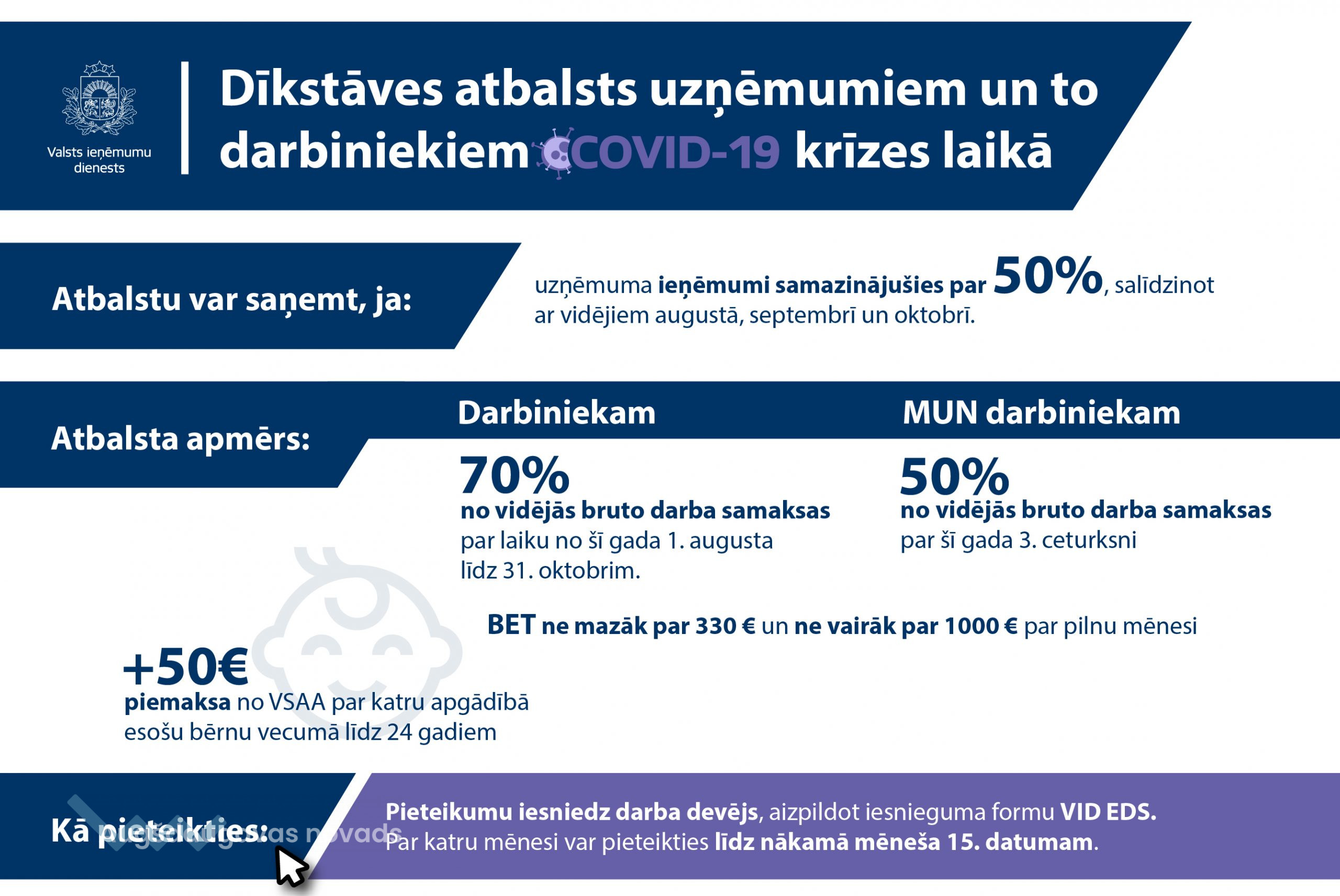 Darbinieki, kas ir dīkstāvē un nestrādā, varēs saņemt atbalstu 70 % apmērā no mēneša vidējās bruto darba samaksas par laiku no šī gada 1. augusta līdz 31. oktobrim. Ja kādā no šiem mēnešiem darbinieks pie konkrētā darba devēja nav strādājis, to vidējā darba samaksas aprēķinā neiekļaus. Savukārt mikrouzņēmuma darbinieki varēs saņemt atbalstu 50 % apmērā no mēneša vidējās bruto darba algas par šī gada 3. ceturksni atbilstoši ceturkšņa deklarācijā norādītājam. Ja darbinieks darbu uzsācis oktobrī, aprēķinam izmantos mikrouzņēmuma papildus sniegto informāciju.
