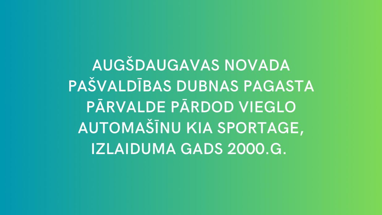 Augšdaugavas novada pašvaldības Dubnas pagasta pārvalde pārdod par brīvu cenu pašvaldībai piederošo kustamo mantu – vieglo automašīnu KIA SPORTAGE, reģistrācijas Nr.HK 4990, izlaiduma gads 2000.g. Vieglajai automašīnai nav veikta tehniskā apskate.