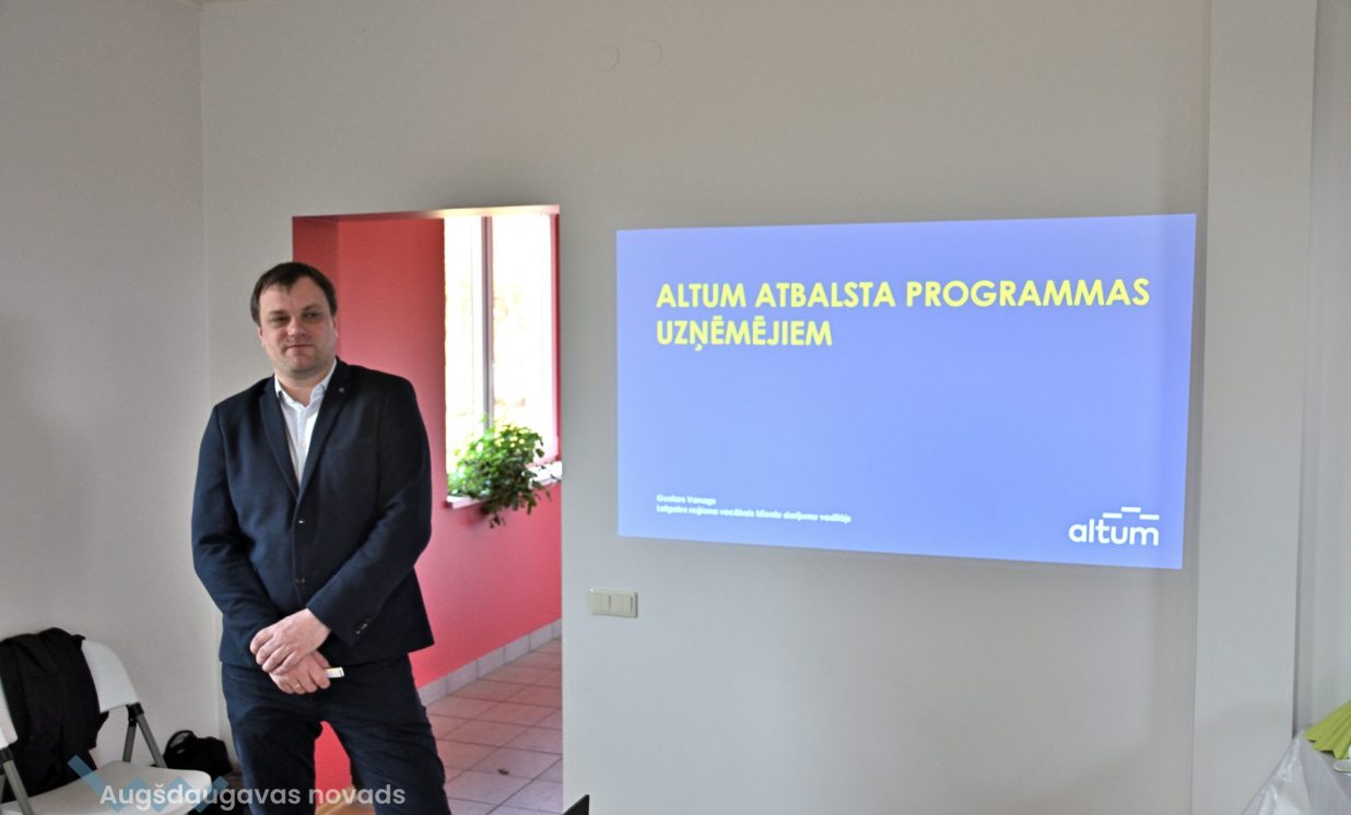 Valsts finanšu institūcijas ALTUM vecākais klientu darījumu vadītājs Guntars Vanags klātesošajiem uzņēmējiem skaidroja ALTUM plānotos atbalsta pasākumus, tai skaitā aizdevumu programmas un atbalsta programmām uzņēmumu energoefektivitātes paaugstināšanai.