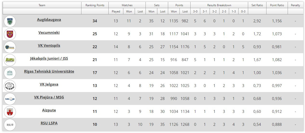 VK "Augšdaugava" ar 34 punktiem saglabā 1. vietu turnīrā, 13 spēlēs gūstot 11 uzvaras.