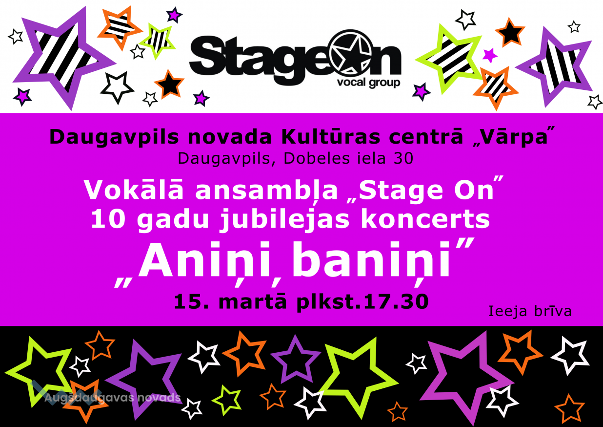 15. martā plkst. 17.30 Daugavpils novada Kultūras centrā “Vārpa” (Dobeles ielā 30, Daugavpilī) notiks vokālā ansambļa „Stage On” desmit gadu jubilejas koncerts „ Aniņi, baniņi”.
