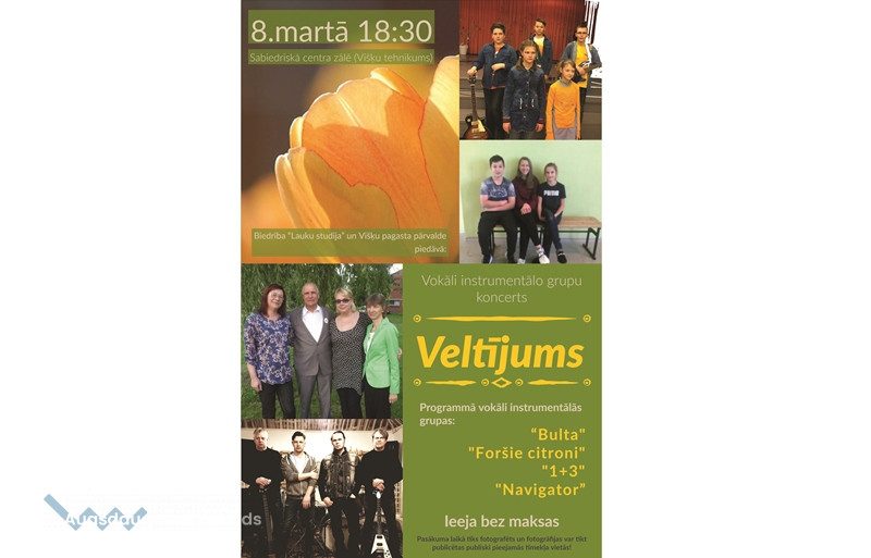 8. martā plkst. 18:30 Višķu pagasta Sabiedriskā centra zālē (Višķu tehnikums) biedrība “Lauku studija” un Višķu pagasta pārvalde aicina ikvienu, bet sevišķi sievietes uz vokāli instrumentālo grupu koncertu “Veltījums”!