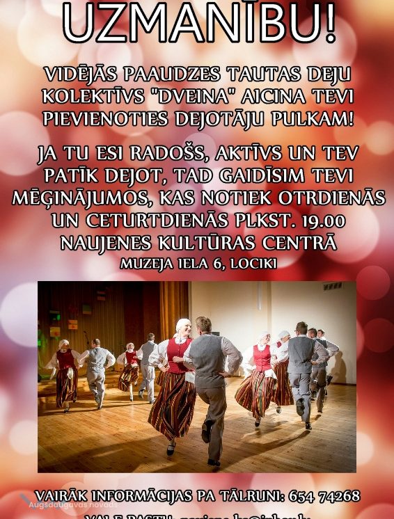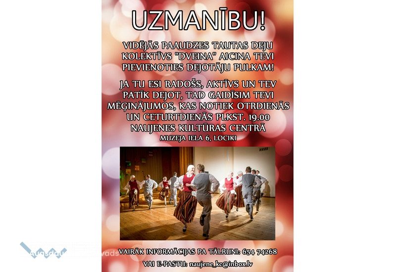 Uzmanību! VPDK "Dveina" aicina pievienoties dejotāju pulkam. Ja esi radošs, aktīvs un tev patīk dejot, tad gaidām tieši tevi uz mēģinājumiem, kas notiek katru otrdienu un ceturtdienu no plkst. 19.00 Naujenes kultūras centrā (Muzeja ielā 6, Lociku ciemā). Tālrunis uzziņām: 654 74268.