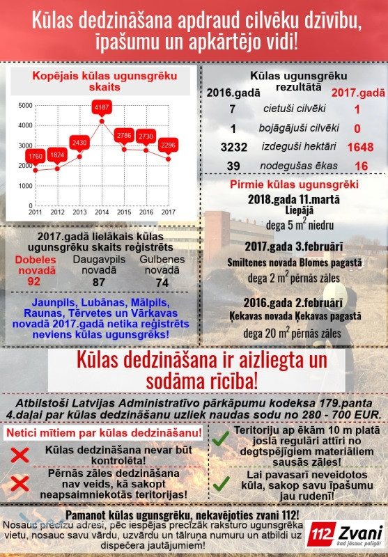 VUGD atgādina, ka kūlas dedzināšana ir aizliegta un tā var apdraudēt cilvēku īpašumu, veselību un dzīvību, kā arī tā rada būtisku kaitējumu dabai! VUGD aicina iedzīvotājus sakopt sev piederošās teritorijas bez kūlas dedzināšanas un gadījumos, ja ir izcēlies kūlas ugunsgrēks – nekavējoties zvanīt VUGD uz tālruni 112.
