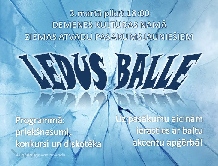 Demenes pagasta jaunieši aicina uz ziemas atvadu pasākumu ''Ledus balle'', kas norisināsies 3. martā plkst. 18.00 Demenes Kultūras namā. Katrai komandai ir jāsagatavo arī neliels ”sasildošs” priekšnesums. Aicinām ierasties ar baltu akcentu apģērbā! Sīkāka informācija un komandas pieteikšanās dalībai pasākumā pa tālruni 25331385 vai rakstot e-pastu uz viktorija.kiselova@demene.lv.