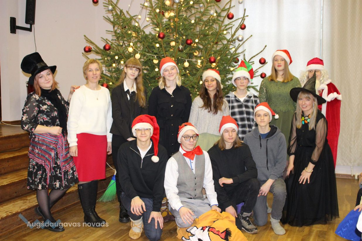 22. decembrī 5. - 9. klašu skolēniem notika Ziemassvētku pasākums. Šogad priekšnesumu veidošanā un rādīšanā iesaistījām vecākus. Paldies vecākiem, kas piedalījās vai palīdzēja sagatavot savu bērnu uzstāšanos! Bija gan visas klases vecāku un bērnu priekšnesums, gan brāļu uzstāšanās, gan mammas un bērnu dziesma, deja un mūzikas instrumentu spēlēšana, kā arī individuālais priekšnesums ar trompetes skaņdarbu un vairāki priekšnesumi ar klašu skolēnu iesaistīšanos. Visu kārtību noteica raganiņas, kas izrādās bija māsas! Tāpēc arī viņas rādīja māsu kopīgo muzikālo priekšnesumu. Raganiņām palīdzēja rūķi. Viņi ienesa Ziemassvētku vecīša dāvanu maisus un palīdzēja dalīt dāvanas par priekšnesumiem, kā arī beigās visiem kopā nodejot deju “Piparkūkas danco!”. Ziemassvētku vecītis katrai klasei dāvanu maisu atdeva tikai tad, kad klases skolēni bija atbildējuši uz dažādiem āķīgiem jautājumiem! Visām klasēm ar skatītāju palīdzību tas arī lieliski izdevās.